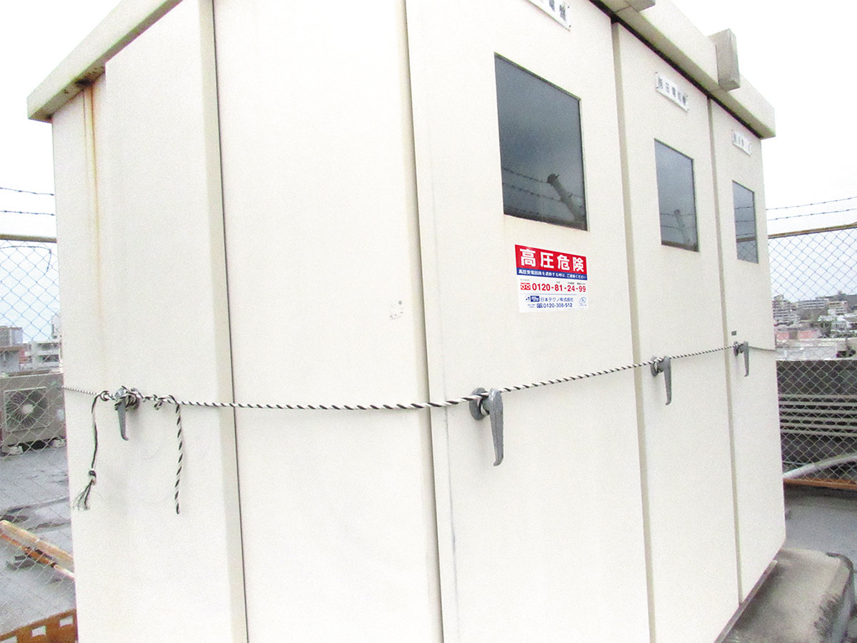 沖縄県にある日本テクノユーザーのキュービクル。台風による強烈な風圧などにより、きちんと施錠をしていても扉が開いてしまうことがあります。それでは雨水の侵入を防げないため、ノブの部分を利用しながらキュービクル全体を囲むようにロープを回しています。
