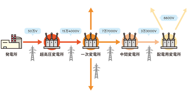 発電所から事業場や家庭に電気が届くまで